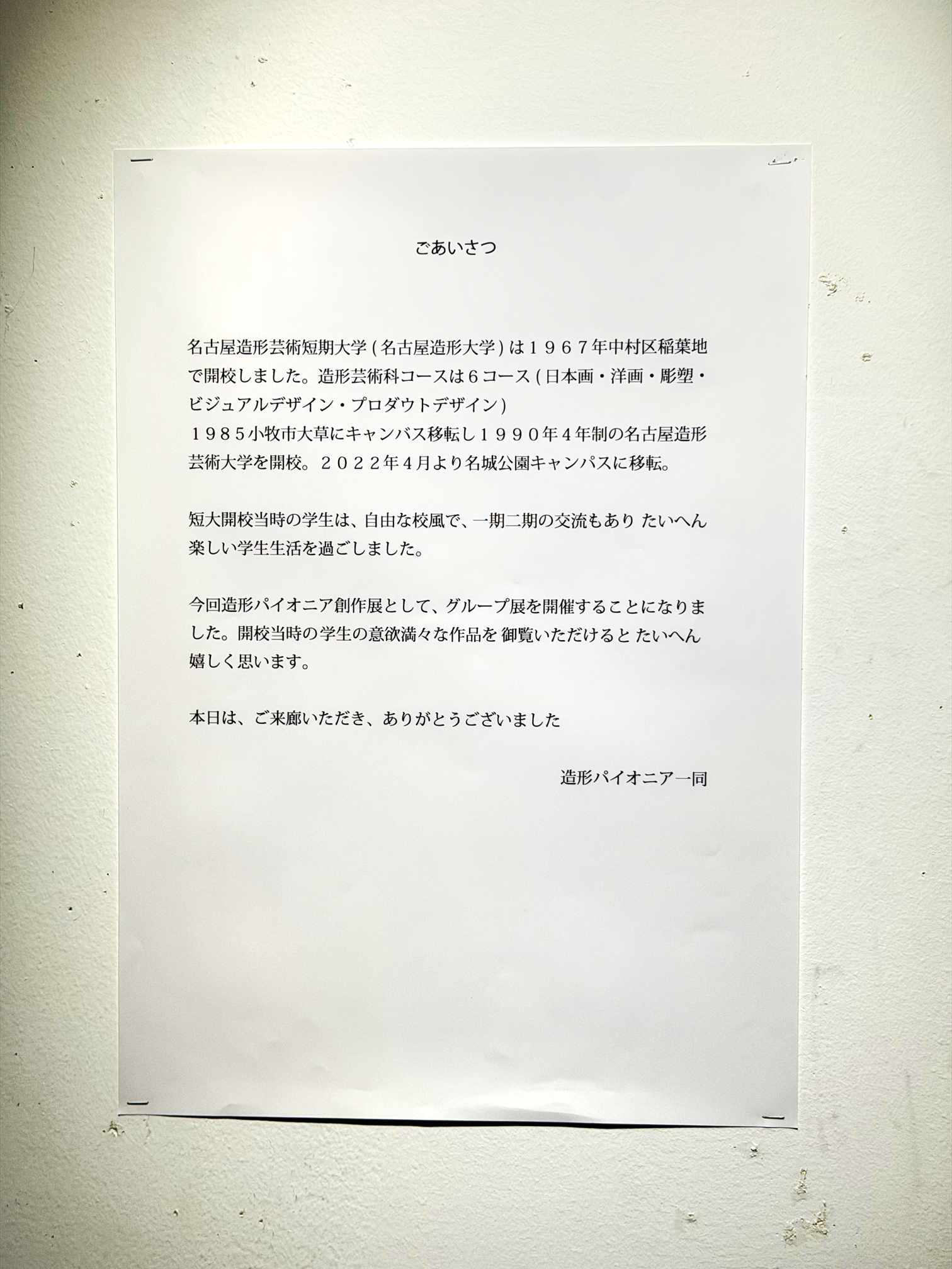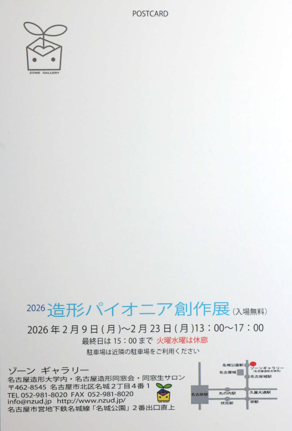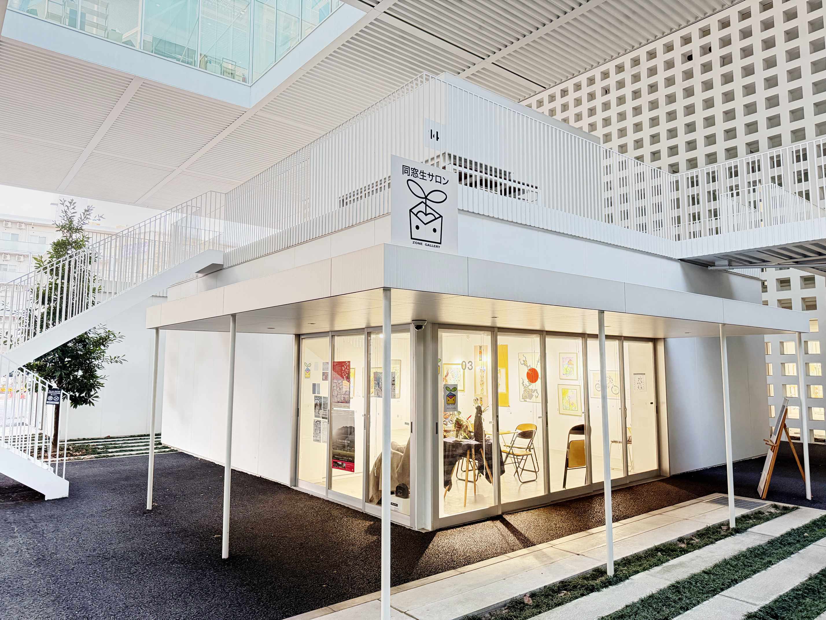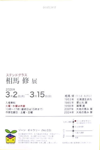 名古屋造形大学は二〇二二年四月 小牧キャンパスより名城公園駅真上のキャンパスに移転しました。名古屋造形同窓会も大学のアートストリートボックス03 に開設し、同時に同窓会事務所内でZONEGALLERY (ゾーンギャラリー)を運営する事になりました。二〇二四年一月より規約により同窓会員の皆さんに多く利用して頂くために、