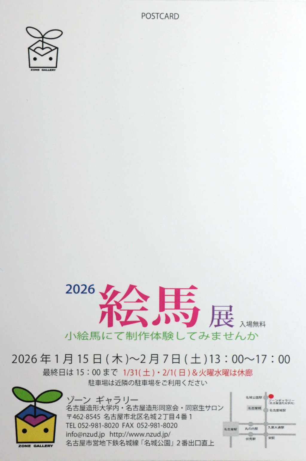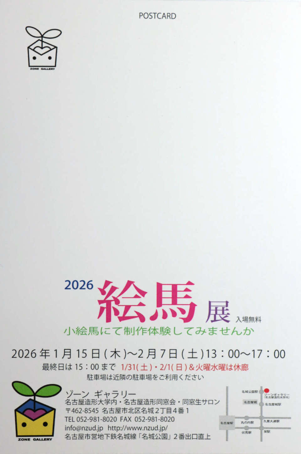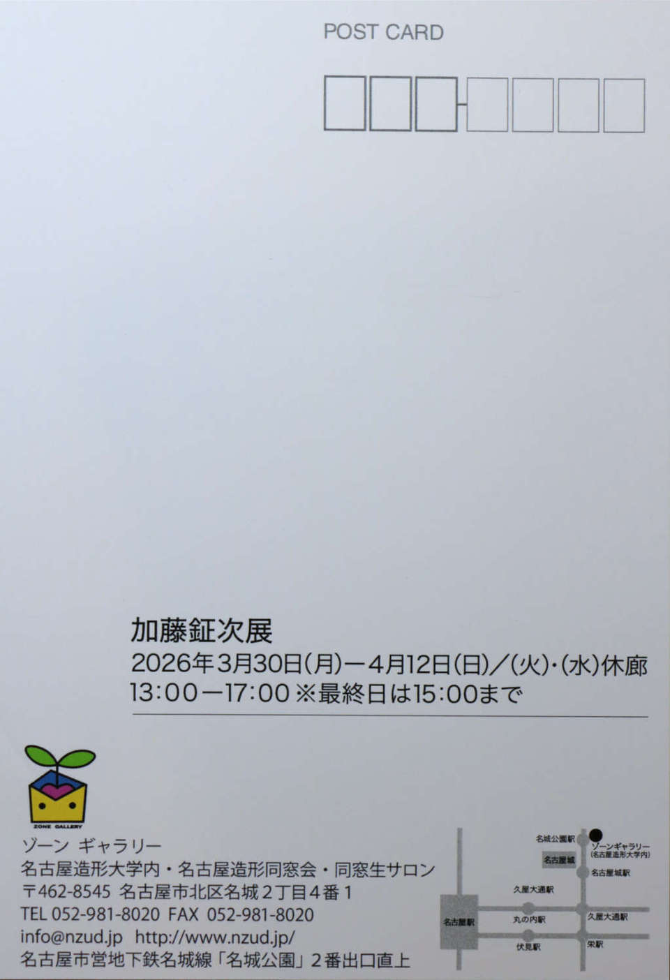 名古屋造形大学は二〇二二年四月 小牧キャンパスより名城公園駅真上のキャンパスに移転しました。名古屋造形同窓会も大学のアートストリートボックス03 に開設し、同時に同窓会事務所内でZONEGALLERY (ゾーンギャラリー)を運営する事になりました。二〇二四年一月より規約により同窓会員の皆さんに多く利用して頂くために、