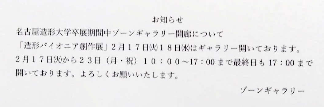 名古屋造形大学は二〇二二年四月 小牧キャンパスより名城公園駅真上のキャンパスに移転しました。名古屋造形同窓会も大学のアートストリートボックス03 に開設し、同時に同窓会事務所内でZONEGALLERY (ゾーンギャラリー)を運営する事になりました。二〇二四年一月より規約により同窓会員の皆さんに多く利用して頂くために、